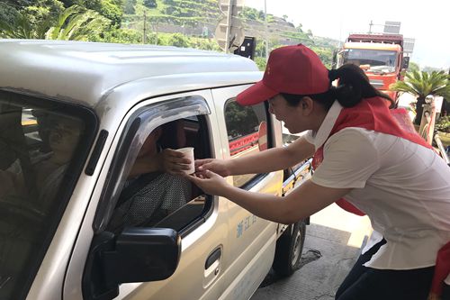 圖為志愿者為過(guò)往司機(jī)遞上消暑品