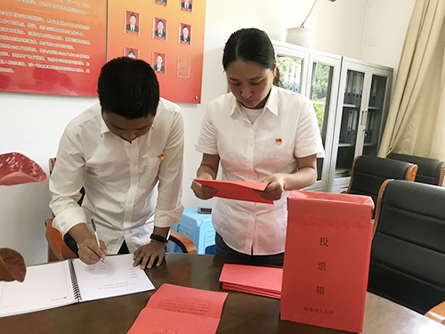 圖為投票現(xiàn)場 會議通過舉手表決方式一致通過了選舉辦法和監(jiān)票人、計(jì)票人名單。本次選舉大會應(yīng)到正式黨員11名,實(shí)到10名。經(jīng)過計(jì)票、監(jiān)票等程序,以差額無記名方式推選孫明偉、周戰(zhàn)、陳瑩三名同志為新一屆支部委員會委員。在隨后召開的支委會第一次會議上,選舉孫明偉任支部書記,周戰(zhàn)任紀(jì)律委員,陳瑩任組織宣傳委員。