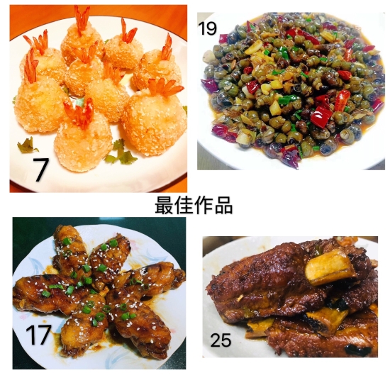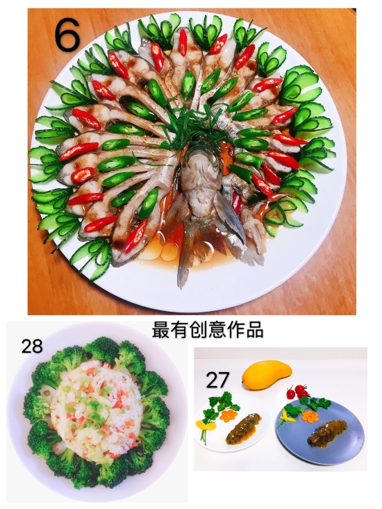 圖為評委團(tuán)評選 本次活動共32幅作品進(jìn)行參評,最終評選出朱英英的《鳳尾蝦球》、謝海云的《饞嘴螺絲》、李菊麗的《昂翔展翅》、陳瑩的《骨色骨香》為“最佳作品”,朱英英的《孔雀開屏》、葉懿慧的《向陽花》、吳琴琴的《秋收》為“最有創(chuàng)意作品”。大家紛紛相約疫情過后,以廚會友、以食為樂,來一場百家宴一飽口福。 陳瑩