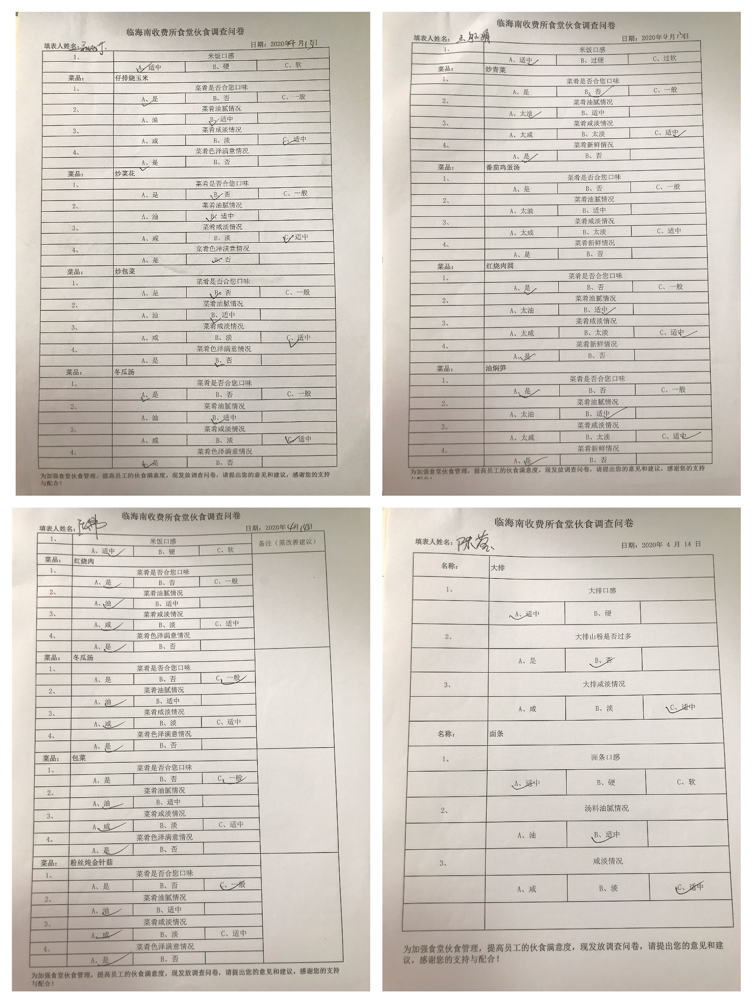 為了提高食堂滿意度,該所從菜肴口味、油膩度、咸淡、色澤等方面制定調(diào)查問卷,讓大家真實(shí)客觀地表達(dá)各自的想法和建議。問卷調(diào)查采用當(dāng)班用餐人員實(shí)名填寫問卷調(diào)查表的形式進(jìn)行,通過收集的問卷,每天中午定期召集食堂人員,反饋前一天的調(diào)查結(jié)果,根據(jù)員工的反饋建議,討論制定整改措施,確保將員工的意見及建議落到實(shí)處。除此之外,每逢傳統(tǒng)佳節(jié),定制相應(yīng)的節(jié)日菜譜,保證員工在站所也能感受到節(jié)日的喜慶和家的溫馨。