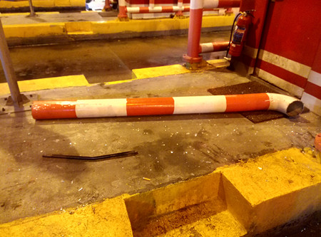 大型貨車過(guò)收費(fèi)站撞斷防撞欄