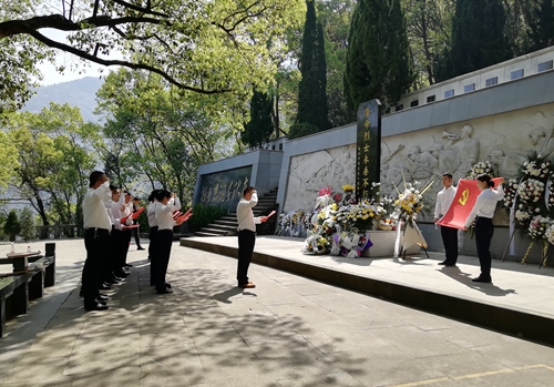 圖為敬獻鮮花 九峰烈士陵園始建于1956年,埋葬著20世紀50年代為國捐軀的120余位革命先烈。墓區(qū)內(nèi)青松翠柏環(huán)繞,墓前豎有一座“革命烈士永垂不朽”的石碑。上午10時許,祭掃儀式開始,全體人員懷著無比崇敬的心情向革命先烈鞠躬默哀,緊接著依次走到紀念碑前敬獻鮮花,表達對革命先驅(qū)的悼念與緬懷之情。在紀念碑前,全體黨員重溫入黨誓詞“我志愿加入中國共產(chǎn)黨,擁護黨的綱領(lǐng),遵守黨的章程......”