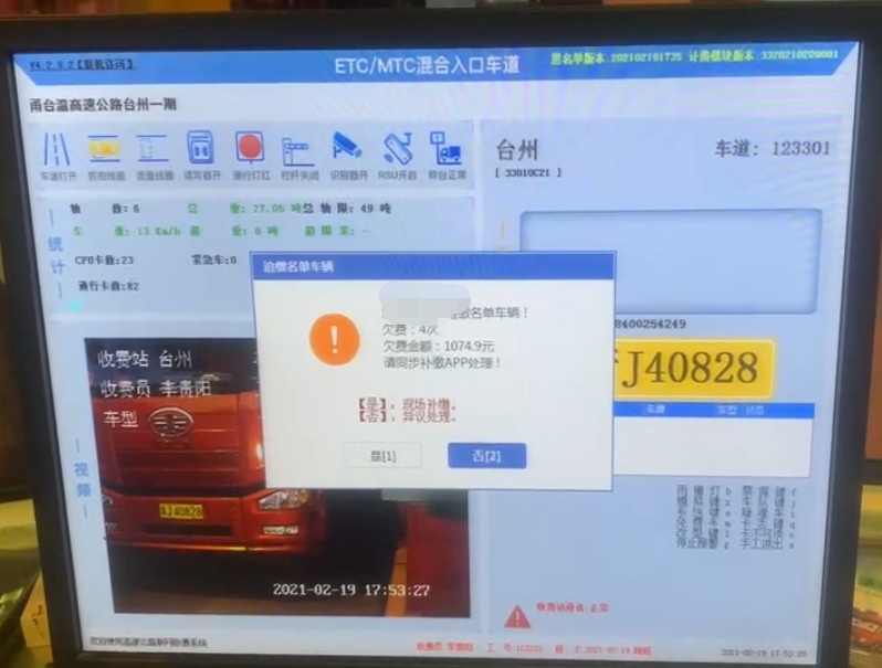 自取消省界收費(fèi)站全國高速公路聯(lián)網(wǎng)后,跨省追繳通行費(fèi)一直是個(gè)大難題,不少司機(jī)的省外通行費(fèi)因無法追繳,造成通行費(fèi)不斷流失。交通部為了適應(yīng)“全國一張網(wǎng)”稽核業(yè)務(wù)工作需要,確保各收費(fèi)站現(xiàn)場(chǎng)有序處理追繳名單車輛,避免造成社會(huì)輿情和人身財(cái)產(chǎn)安全事件,研發(fā)了全國稽核通行費(fèi)補(bǔ)費(fèi)系統(tǒng)。 2月19日晚17點(diǎn)50分左右,臺(tái)州收費(fèi)所進(jìn)口迎來一輛車牌為浙J開頭的六類貨車,車道屏幕顯示為“浙J XXXXXX追繳名單車輛,欠費(fèi)4次,欠費(fèi)金額1074.9元,請(qǐng)同步補(bǔ)繳APP處理?!碑?dāng)班收費(fèi)員見此詢問駕駛員是否欠費(fèi),并喊來當(dāng)班班長張錚過來處理。