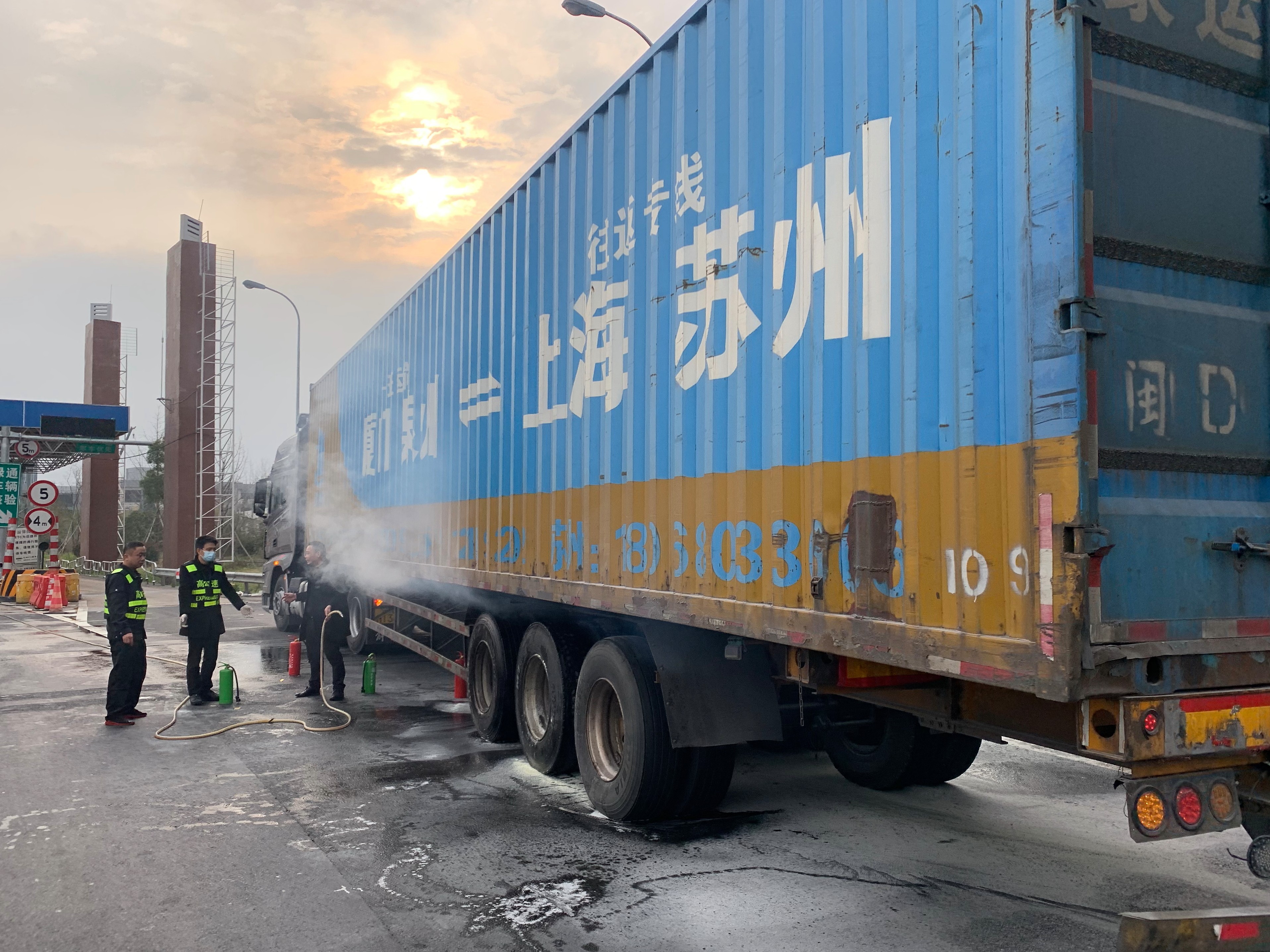 “停車,停車,輪胎起火了?!笔召M員盧靜對著貨車不停搖手,喊話,貨車駕駛員這才發(fā)現(xiàn)情況,在內(nèi)廣場附近停下來。 時間就是生命,時間就是速度,當班班長張錚,副班長黃智超和收費員鐘鴻廣第一時間拿起崗?fù)ね獾臏缁鹌鞅枷蚱鸹疖囕v。大家齊心協(xié)力,火苗瞬間被壓了下去。