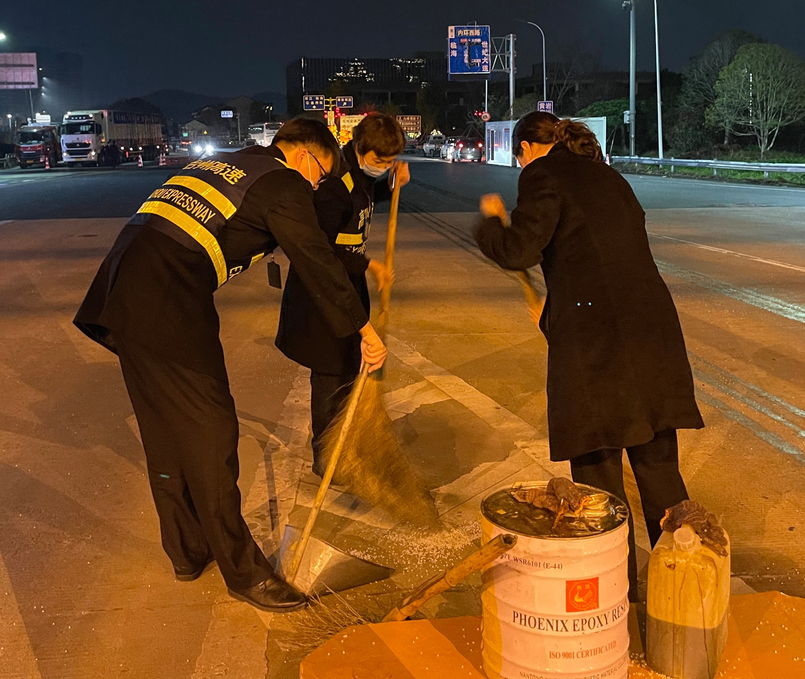 (圖為工作人員在清掃) 一時之間,車道路面上落滿大量的塑料顆粒,考慮到夜色已深,ETC車道上行駛的車輛速度大多很快,萬一司機沒有及時發(fā)現前方道路上的灑落物,極易造成輪胎打滑,嚴重影響行車安全。情況緊急,為了后續(xù)通行車輛的安全,收費班長立刻關閉了該ETC車道,并放置警示標志,然后將這一情況上報給監(jiān)控中心和收費所值班人員。不等清潔人員到來,收費員羅時杰從車道的工具房拿出掃帚和簸箕,主動開始清掃工作。隨后其他不坐崗的收費員也投入到了清掃工作中,這支臨時清掃小隊在沒有任何人的領導下自發(fā)地組織起來。這時,從高速上完成機電養(yǎng)護工作的機電班工作人員正巧路過,他們看到這一幕立刻將車??吭谝贿?,加入清掃隊伍。盡管散落的塑料顆粒數量較多,但在大家的共同努力下,車道終于被清理干凈,恢復了正常通車。 春日的夜晚微風拂過,已有春的暖意,而更暖的是這一幕在春夜里的一個個身影。大家因為一件小事而聚在一起,然而安全無小事。所有人心系安全,為所有過往車輛保暢保安全,為臺州高速貢獻自己的一份力。 崔翔浩 吳侃霓