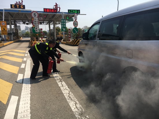 圖為交通事故應(yīng)急演練 在收費(fèi)廣場(chǎng)交通事故應(yīng)急預(yù)案演練中,該所模擬了汽車在收費(fèi)車道起火的交通事故。事故發(fā)生后,當(dāng)班班長(zhǎng)第一時(shí)間啟動(dòng)預(yù)案,將險(xiǎn)情報(bào)告監(jiān)控員,并立即關(guān)閉事故車道,組織人員對(duì)起火點(diǎn)進(jìn)行前期壓制,同時(shí)指揮人員擺放標(biāo)志,引導(dǎo)后續(xù)車輛,并快速放行。接到險(xiǎn)情報(bào)告的所長(zhǎng)、辦公室人員迅速趕到現(xiàn)場(chǎng)參與救援:女同志協(xié)助班組開(kāi)足車道;部分男同志負(fù)責(zé)出入口車輛的疏導(dǎo)指揮工作;其余人員負(fù)責(zé)對(duì)火災(zāi)進(jìn)行撲滅……大家各司其職,快速處理險(xiǎn)情。