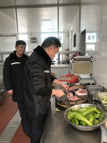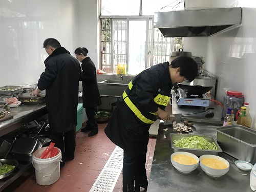 圖為工作人員幫忙做飯 臨近春節(jié)又正值春運(yùn)期間,一時(shí)也找不到人員替代。為了保證員工正常用餐,中午,楊瑩瑩決定親自下廚為員工做飯,冰冷的水里直接洗菜,掄起廚刀剁肉切菜,卷起袖子熱鍋炒菜,儼然成為合格的大廚。副所長周超、杜佳自動(dòng)加入司廚行列,其他行政人員在一旁配合摘菜、剝蒜等等,正在休息的班組其他人員見狀也紛紛前來幫忙。這一刻,小小廚房其樂融融,那是家的味道。午餐過后,楊瑩瑩又開始考慮晚餐和明天的早餐,但是她不再發(fā)愁,因?yàn)樯砗筮€有無數(shù)個(gè)他們。