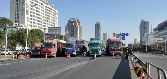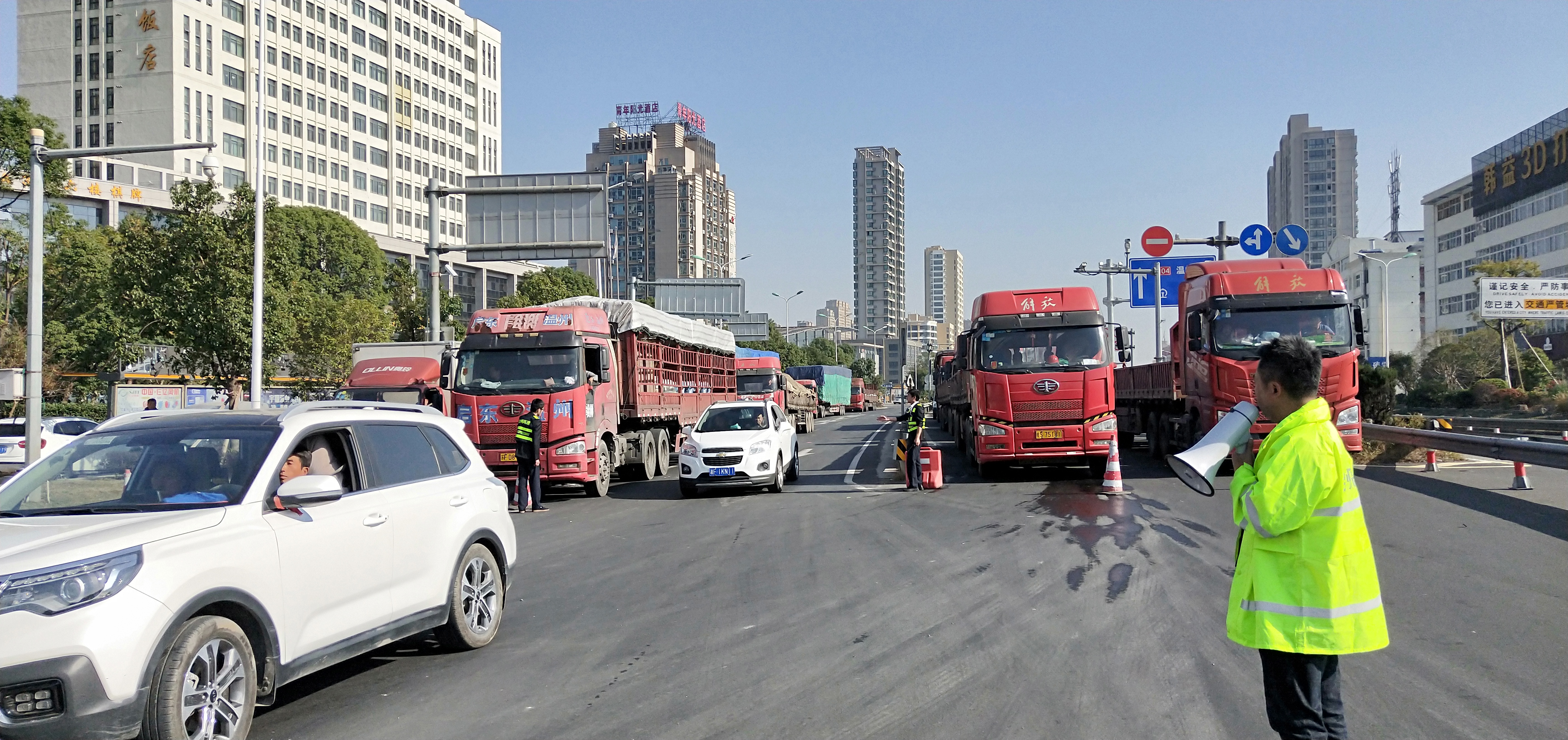 圖為所班子成員帶頭指揮交通 早上8點11分,接到監(jiān)控中心電話:入口開通,開足兩個人工車道。當時正值新收費模式開通前對稱重超限車輛勸返工作的開始。經(jīng)過幾個小時封道,此時的入口車流已經(jīng)一望無際,如果碰到超限車輛,勸返更是難上加難。 在困難中想對策,所領導班子成員提出“輪流式放行”:入口的車輛分別是從橋上和橋下過來,分為4個車道,每個車道輪流放行5分鐘,這樣井然有序,不容易造成擁擠和交通事故,并且可以快速放行。每個車道前都擺放了一個小紅帽,專人看守。其他人員分別在入口指揮,藍牌貨車和未安裝ETC的車輛從大小客車車道通行,大貨車從混合車道通行,裝有ETC的客車和集裝箱走ETC專用通道。大家不斷穿梭在車道、廣場之間,向司機一遍遍耐心解釋,指揮每一輛車順利通行。1名孕婦行動不便,被分在監(jiān)控室接聽電話,查詢入口無信息的車道。所有人一身汗,忙得顧不上喝一口水,臨近飯點也沒有人主動去吃飯,大家都頂住壓力,從黎明到黃昏一心想著快速準確高效放行。