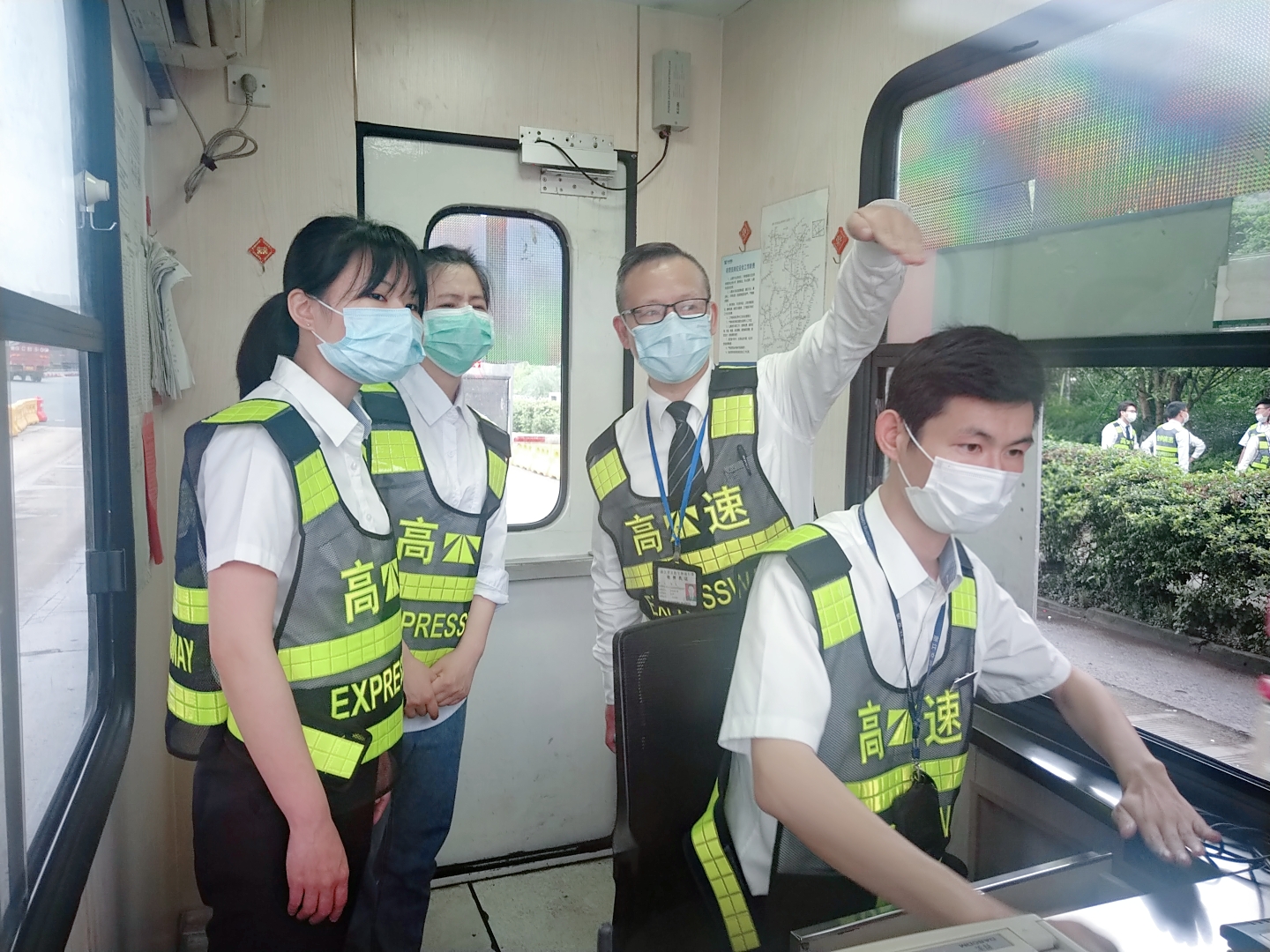 圖為陳軍帶領新員工在崗亭培訓 新員工的到來,為該所注入了新鮮的血液,增添了青春活力。為了讓新員工能夠快速“入鄉(xiāng)隨俗”,盡快適應收費站工作環(huán)境,順利完成角色轉(zhuǎn)換,當日他們就跟著資深班長陳軍學習相關業(yè)務知識。