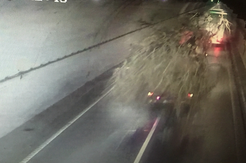 圖為超高超寬的運(yùn)樹大貨車 5:10分,違章大貨車通過黃土嶺隧道,由于大貨司機(jī)一直違章占隧道中線行駛,未對(duì)黃土嶺隧道設(shè)施設(shè)備造成影響,執(zhí)勤隊(duì)員便跟在違章車輛后面關(guān)注其進(jìn)出口動(dòng)向。 5:29分,違章車輛在臺(tái)州南副站出口處被執(zhí)勤隊(duì)截停,等待處理善后事故的交警車輛到來。
