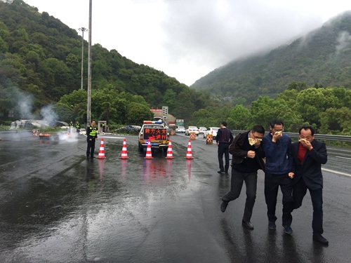 圖為安全有序疏散群眾現(xiàn)場 執(zhí)勤隊(duì)緊急出動,趕赴事故現(xiàn)場。“哎呀,著火啦!”事故車上司乘人員呼喊著:“快!快救火!快救人!”一組人員迅速擺放安全警示牌后,快速有序地將滯留群眾疏散到安全位置,另一組人員利用消防水槍滅火,控制事故車輛火情蔓延,值勤隊(duì)長根據(jù)現(xiàn)場判斷,果斷地通知中控員開啟隧道風(fēng)機(jī)系統(tǒng),對隧道內(nèi)濃煙進(jìn)行處理,隨后成功撲滅大火。