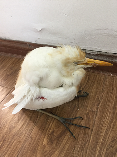 圖為受傷的牛背鷺 走近細(xì)看,這只鳥耷拉著腦袋,有著圓滾滾的小身子,尖尖的嘴巴和細(xì)長的腿,不同于平常所見的鳥類,其左側(cè)翅膀還有紅紅的血印子,估計是被人射獵受傷。 后經(jīng)百度查詢,臺州市林業(yè)專業(yè)人員鑒定確認(rèn),此鳥為省級保護(hù)鳥類牛背鷺。專業(yè)人員欣慰地說,幸好隧道所人員及時救助,否則這只鳥鷹會有生命危險。它的翅膀受傷嚴(yán)重,這是奮力飛行一段時間后因受傷而掉落,已經(jīng)沒有了捕殺能力。