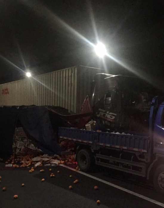 圖為事故現(xiàn)場 得知此情況,所負(fù)責(zé)人第一時間趕赴事故現(xiàn)場。事故就是命令!救援隊伍立即兵分三組,一組由駕駛員林通用巡邏車送傷者至臺州收費所出口,與前來救援的120救護(hù)車進(jìn)行對接,一組由金志輝、宋勤滿在寧向南洞口卡口,一組由李海福所長、應(yīng)錦清副所長在現(xiàn)場協(xié)調(diào)指揮,同時配合交警維護(hù)通行秩序,與交警一起對事故現(xiàn)場展開救援。 經(jīng)了解,由于藍(lán)色貨車超車道緩慢行駛,集裝箱與貨車發(fā)生車輛剮蹭追尾導(dǎo)致后方送桔貨車側(cè)翻。貨車上的桔子多半散落,給清障帶來一定的難度,管理所負(fù)責(zé)人、高速交警、清障人員、養(yǎng)護(hù)人員共同當(dāng)起了“指揮員”、“搬運工”,全力清理事故現(xiàn)場。 16時36分,由于處理及時,措施得當(dāng),事故未造成大面積擁堵,道路恢復(fù)正常通行。 林玲
