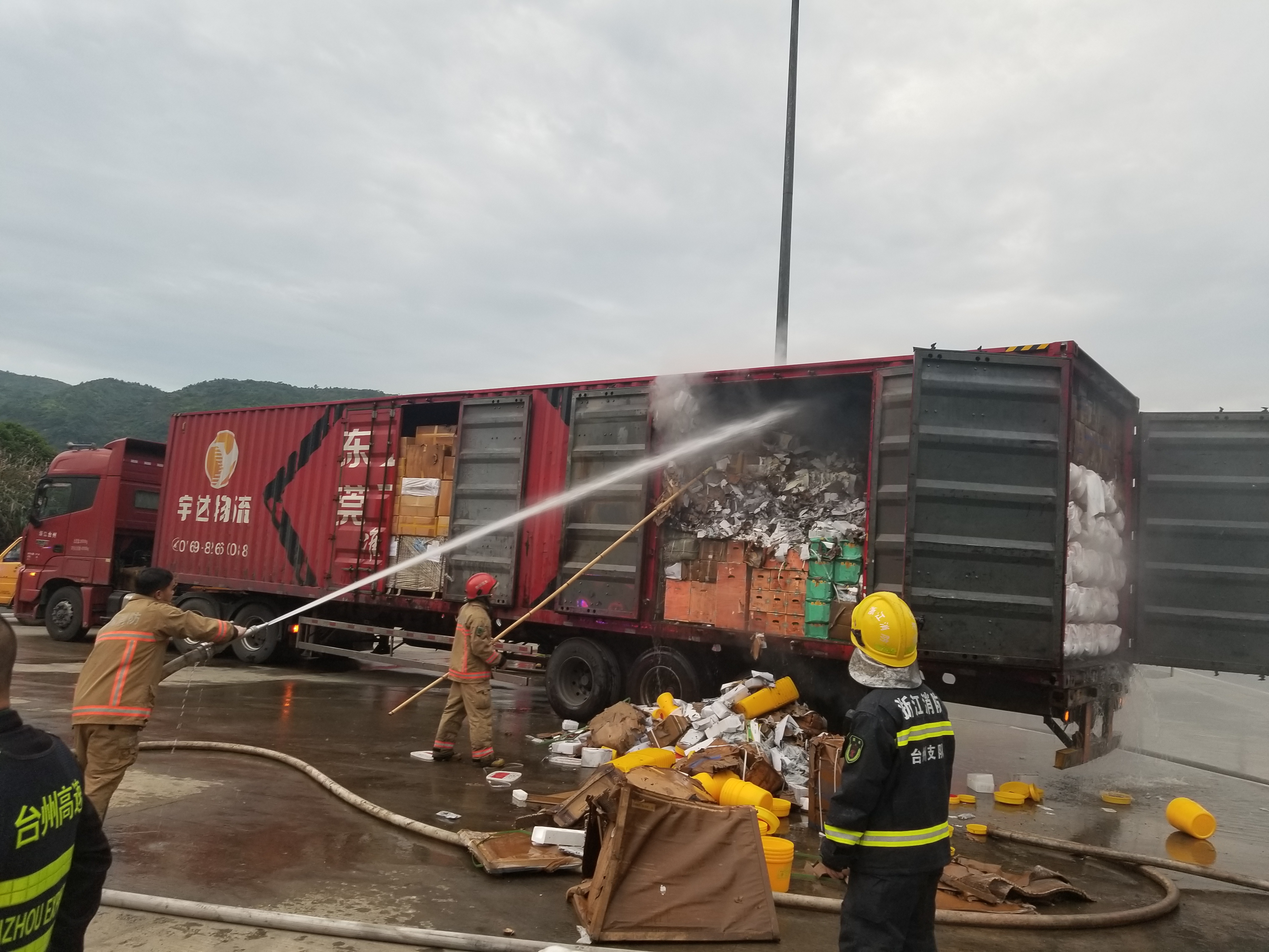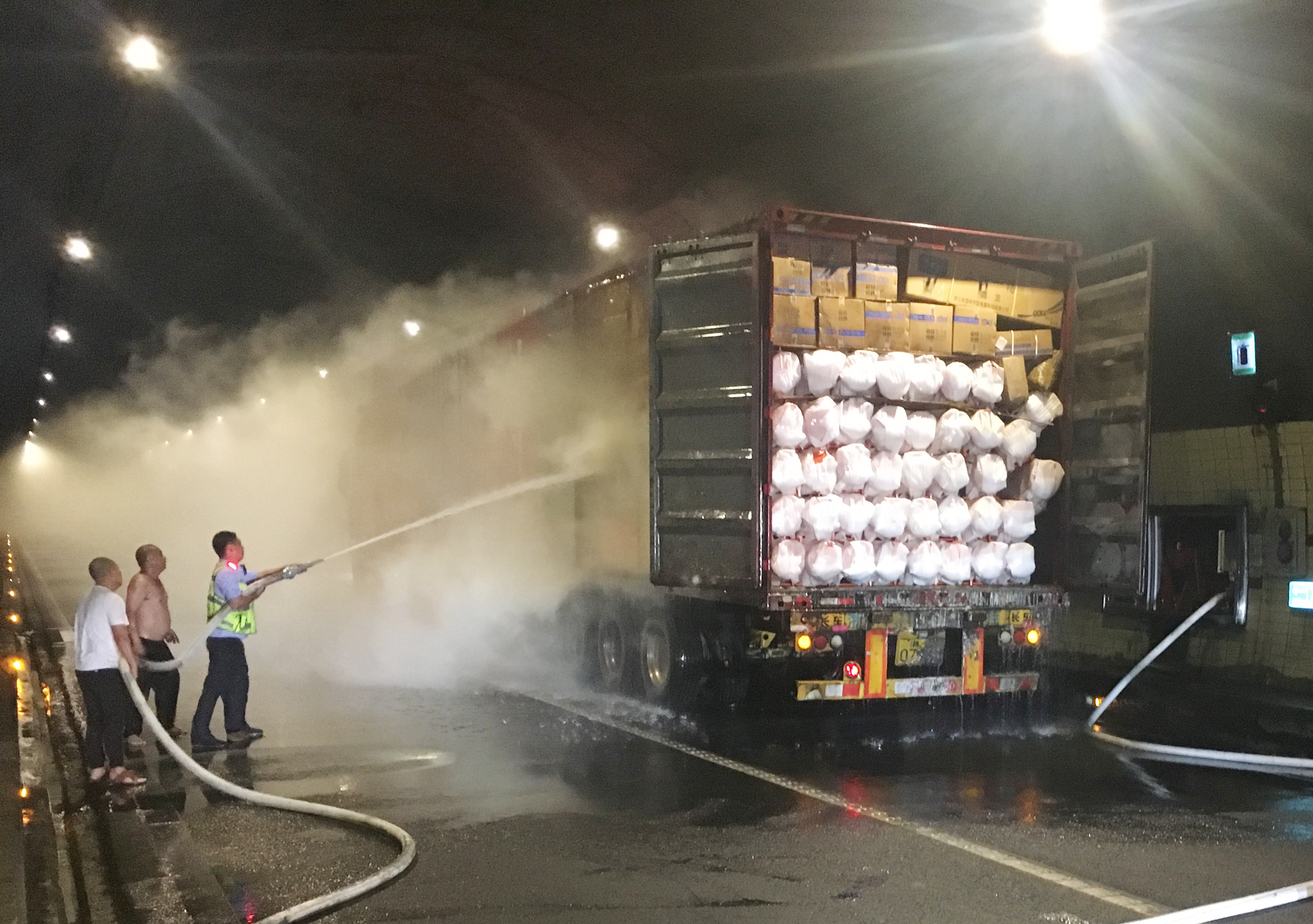 圖為滅火現(xiàn)場 萬幸的是,恰逢溫州高速交警巡邏車經過,隨即在該貨車后方預警,很快的所巡邏車、消防車先后到達現(xiàn)場協(xié)同滅火。由于該車貨物較多,且裝載物皆為紙箱和塑料,集裝箱底層溫度較高,一時只能將明火撲滅,但車廂內仍有大量煙霧,為了安全,車子必須盡快撤離隧道,執(zhí)勤隊當即決定讓駕駛員把車開往南廣場繼續(xù)滅火,消防車則一路緊隨其后滅火,以防火勢變大。 05:02分,大貨車終于開至南廣場,消防隊員對車上的貨物進行清理,才徹底將此次火災撲滅,隧道恢復安全行車。