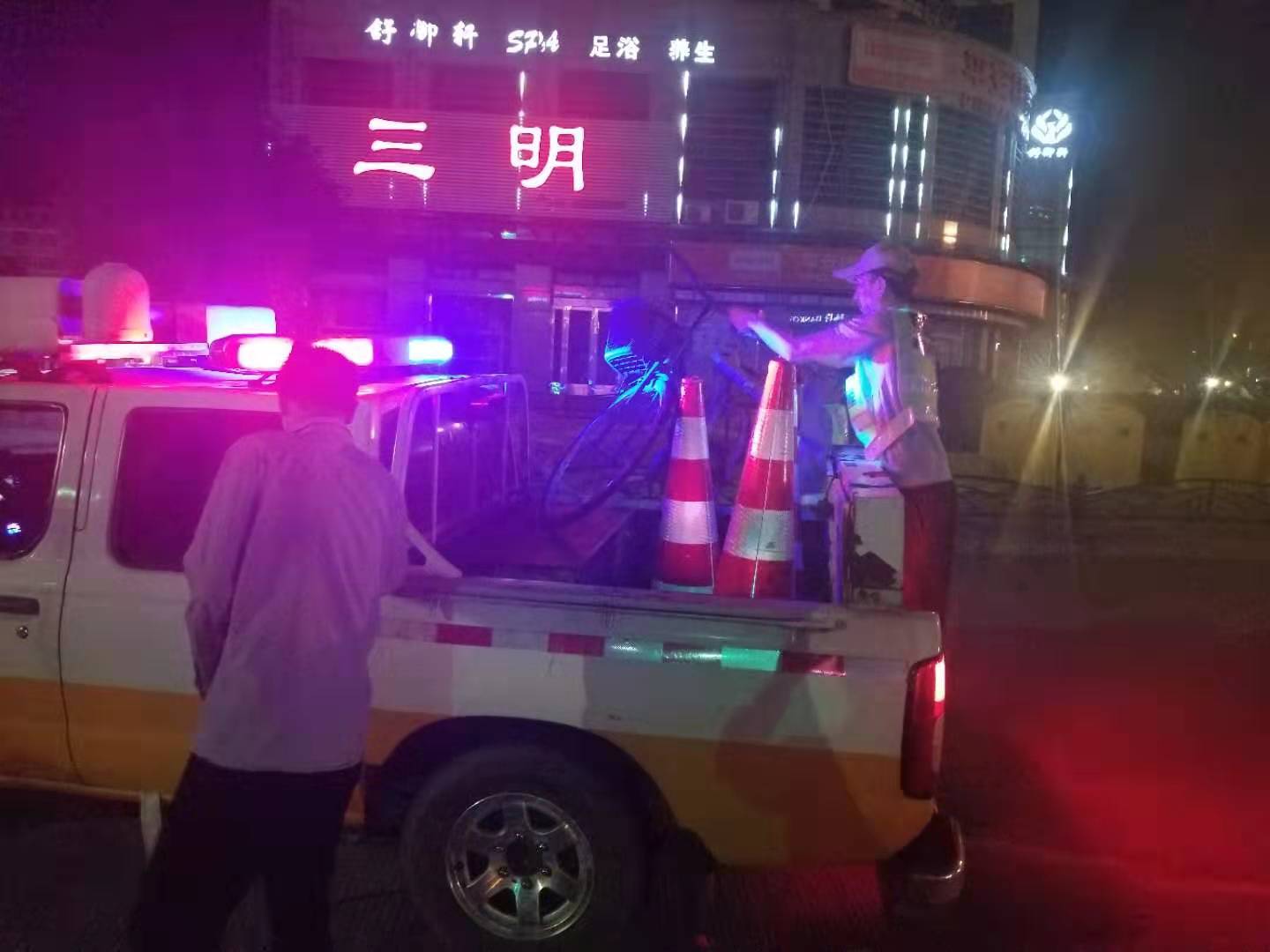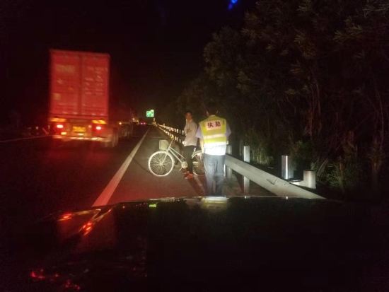圖為執(zhí)勤隊(duì)發(fā)現(xiàn)騎車人 9月24日21:09分,大溪嶺隧道所中控室發(fā)出通知。執(zhí)勤隊(duì)員接中控指令,迅速出警。晚上九點(diǎn),在高速公路上找人,需得打上12分的精神,巡邏車放慢車速,坐于后座的隊(duì)員們緊盯著車道兩旁,終于在21:14分,距離寧向隧道出口一公里處發(fā)現(xiàn)該騎車男子,隊(duì)員們立即上前將其攔住。眼前的一幕令執(zhí)勤隊(duì)員嚇出一身冷汗,該男子左手殘疾,單手騎車,晚上視線模糊,且高速公路上車多,速度快,司機(jī)很難發(fā)現(xiàn)有行人,如發(fā)現(xiàn)躥出來的行人而采取緊急制動(dòng),會(huì)造成多起追尾事故,現(xiàn)場情況非常危險(xiǎn)!隊(duì)員們合力將自行車抬上車。
