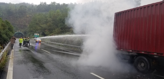 隧道外突發(fā)火情,執(zhí)勤隊(duì)火速救援 11月23日上午09:15分,一陣急促的警鈴聲響起,大溪嶺北情報(bào)板附近硬路肩有一集裝箱貨車車頭起火,執(zhí)勤三隊(duì)隊(duì)長(zhǎng)剛好在中控室,迅速組織執(zhí)勤隊(duì)員趕往現(xiàn)場(chǎng)。