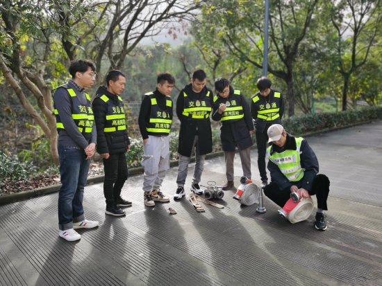 圖為陶文輝在教樂清公司員工如何進(jìn)行水帶操作 本次培訓(xùn)對隧道預(yù)警流程、二帶連接及執(zhí)勤隊在平時巡邏、預(yù)警、處理事故中如何確保自身安全等進(jìn)行重點講解。執(zhí)勤隊長帶領(lǐng)隊員們在管理所操場進(jìn)行模擬主線卡口、事故拋錨車預(yù)警封道操作,樂清公司員工觀摩之后也進(jìn)行實際操作,孫鵬詳細(xì)講解擺放隔離錐應(yīng)注意事項,每一隔離錐的間隔位置、巡邏車后方擺放的安全距離,事故處理之后,收隔離錐應(yīng)注意的安全動作。陶文輝為樂清公司員工演示“二帶連接”,并對水帶的甩、接、收每一動作盡可能詳細(xì)仔細(xì)地進(jìn)行解說示范。
