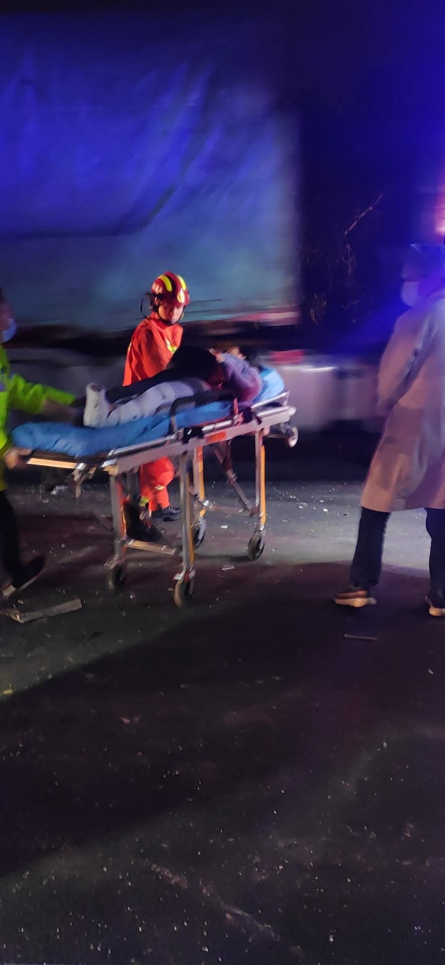 21:50巡邏車和消防車同時(shí)到達(dá)現(xiàn)場(chǎng),隊(duì)員陳幸飛快的跑下來,以百米沖刺的速度做好巡邏車的安全措施和預(yù)警工作,有3人受傷,事故車頭已嚴(yán)重變形,一名女性腰部受傷坐在地上,語速正常,思維清晰。還有二名人員被卡在駕駛室,消防隊(duì)員正在查看現(xiàn)場(chǎng)準(zhǔn)備施救,受傷人員哭爹喊娘嚎聲不斷,由于救護(hù)車還沒達(dá)到現(xiàn)場(chǎng),陳幸在事故車后方硬路肩上維護(hù)秩序,防止車輛占道,并同時(shí)迎接救護(hù)車,湯寧光則在維護(hù)現(xiàn)場(chǎng)秩序,阻止其他司機(jī)圍觀影響救援。 22:00第一輛救護(hù)車到達(dá)。醫(yī)護(hù)人員準(zhǔn)備擔(dān)架,另一名醫(yī)生去詢問坐在地上的受傷人員,由于車頭嚴(yán)重變形,司機(jī)與鄰座的人都被卡在駕駛室,經(jīng)過消防員的救援,受傷最嚴(yán)重的司機(jī)首先被救了下來,在被救下的那刻暈了過去,醫(yī)護(hù)人員立該把傷員抬上救護(hù)車,緊接著消防員救下第二位被卡傷員,第二輛救護(hù)車帶著傷員離開,最后一輛救護(hù)車卻遲遲沒到,經(jīng)聯(lián)系監(jiān)控中心后得知救護(hù)車已上高速,但因后方車輛太多,救護(hù)車和拖車都被堵了,經(jīng)和臺(tái)州高速交警協(xié)商后,最后清理一個(gè)車道讓救護(hù)車和拖車先開上來,巡邏車去事故車后方預(yù)警,22:30救護(hù)車帶走最后一名傷員,事故車被拖走,路面恢復(fù)正常通車。