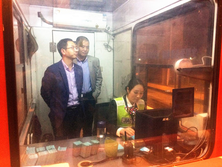 公司副總經(jīng)理董阿林夜訪收費(fèi)所 4月11日晚上,公司副總經(jīng)理董阿林來到沿線四個(gè)收費(fèi)所了解現(xiàn)場(chǎng)收費(fèi)工作。征費(fèi)部相關(guān)人員陪同檢查。