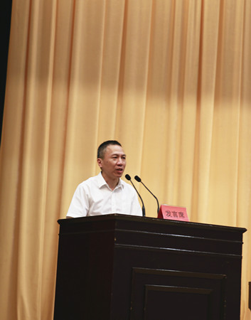 圖為集團(tuán)黨委副書記、副董事長、總經(jīng)理張建平在主席臺(tái)上作交流發(fā)言