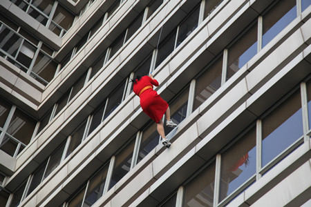 圖為演練前集團(tuán)安全總監(jiān)項(xiàng)同富介紹高層緩降逃生設(shè)備 培訓(xùn)結(jié)束后,參會人員集體到集團(tuán)大樓5樓外平臺觀摩高層緩降逃生演練。在演練中,2名模擬被困人員先后使用高層緩降逃生設(shè)備從16樓窗口平安緩降逃生到5樓平臺。之后通過演練和講評,大家進(jìn)一步熟悉了高層緩降逃生設(shè)備及使用方法,拓展了高層建筑逃生思路。 陳科