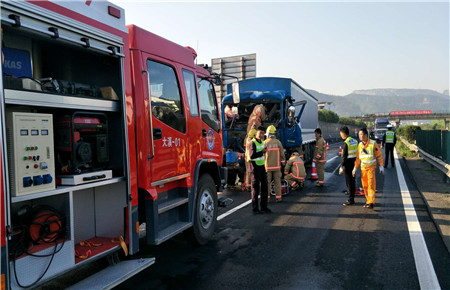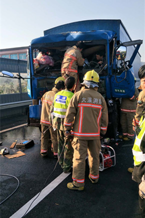4月19日上午6點10分,寧向大溪出口正在進行分流,所有車輛正緩慢前行中,一輛贛F38***牌照的藍色大貨車顯然還沒有適應這分流的節(jié)奏,“砰”地一聲猛然撞上了前面的大貨車。 兩個“大家伙”碰撞的威力非同小可,直接的后果就是后車的車頭變形,損傷極大,貨車駕駛員被卡在車頭里出不來。 時間就是生命,施救中心迅速出動,配合交警、消防部門在現(xiàn)場進行預警,并協(xié)助進行事故處理。