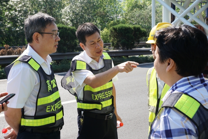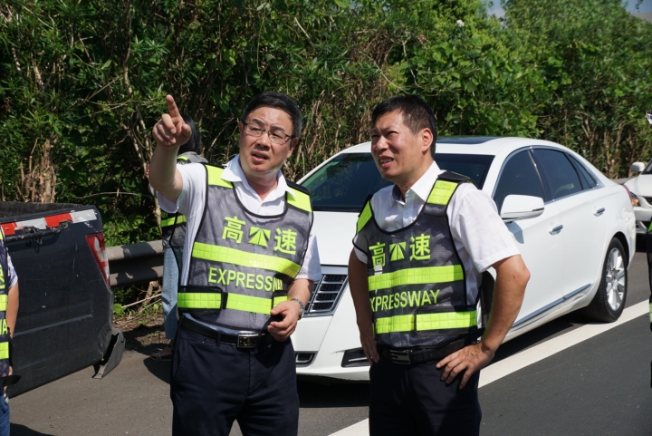 在甬臺溫高速公路臺州段溫州方向主線K1668+200M處現(xiàn)場,陳文波詳細(xì)了解龍門架吊裝的施工工序、取消省界收費(fèi)站總體施工進(jìn)展情況、項(xiàng)目時間節(jié)點(diǎn)、人員班組安排及安全措施準(zhǔn)備情況等。