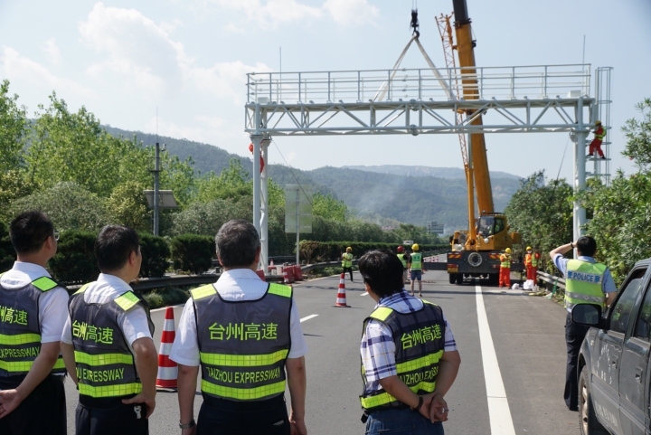 在吊裝過程中,施工現(xiàn)場只進(jìn)行了短短十分鐘的交通斷流。隨著臺州高速取消省界收費(fèi)站項(xiàng)目第一個主線龍門架吊裝完成,這也標(biāo)志著此項(xiàng)工程進(jìn)入了快車道。