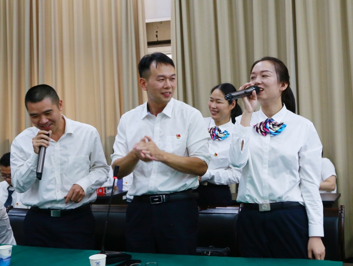 “我和我的祖國,一刻也不能分割......”搶答環(huán)節(jié)中,回答錯(cuò)誤的支部齊齊起立,表演了一段經(jīng)典紅歌。在輕松的氛圍中走進(jìn)黨章黨規(guī)、十九大精神知識,深入學(xué)習(xí)習(xí)近平新時(shí)代中國特色社會主義思想,既有“意義”又有“意思”,既有“氛圍”又有“格調(diào)”。