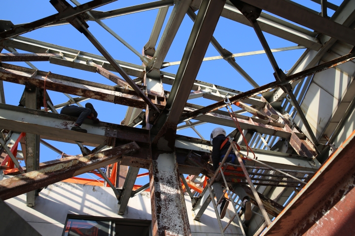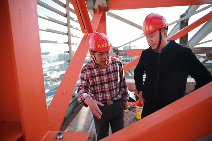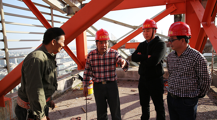 集團(tuán)安全總監(jiān)項(xiàng)同富檢查天和大廈除銹施工 11月15日下午,集團(tuán)安全總監(jiān)項(xiàng)同富在辦公室、房產(chǎn)公司相關(guān)人員的陪同下,到天和大廈樓頂鋼架除銹施工現(xiàn)場(chǎng)檢查施工進(jìn)展和安全工作。 集團(tuán)總部天和大廈樓頂鋼架跨度大,高低水平不一致,很難搭建大范圍的防護(hù)網(wǎng)及腳手架等施工輔助工具,也無(wú)法采用大型機(jī)械打磨除銹的方式除去表面的銹層,只能靠手工和電動(dòng)角磨機(jī)除銹。施工人員常常進(jìn)行高空作業(yè),安全隱患大。