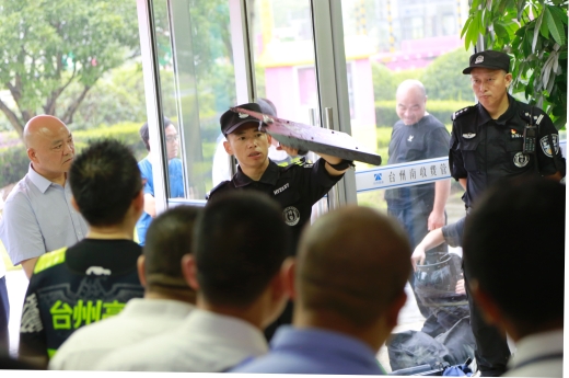 本次活動(dòng)分成防暴器械使用培訓(xùn)、器械使用練習(xí)和防盜搶應(yīng)急演練三個(gè)環(huán)節(jié),以培訓(xùn)和演練相結(jié)合的形式開展,以有效提高一線職工防暴器械使用技能和突發(fā)事件應(yīng)急處置能力?;顒?dòng)邀請(qǐng)了黃巖公安分局巡特警大隊(duì)大隊(duì)長盧健星,該大隊(duì)獵豹突擊隊(duì)隊(duì)員、專職教官盧尚明到場(chǎng)指導(dǎo)。