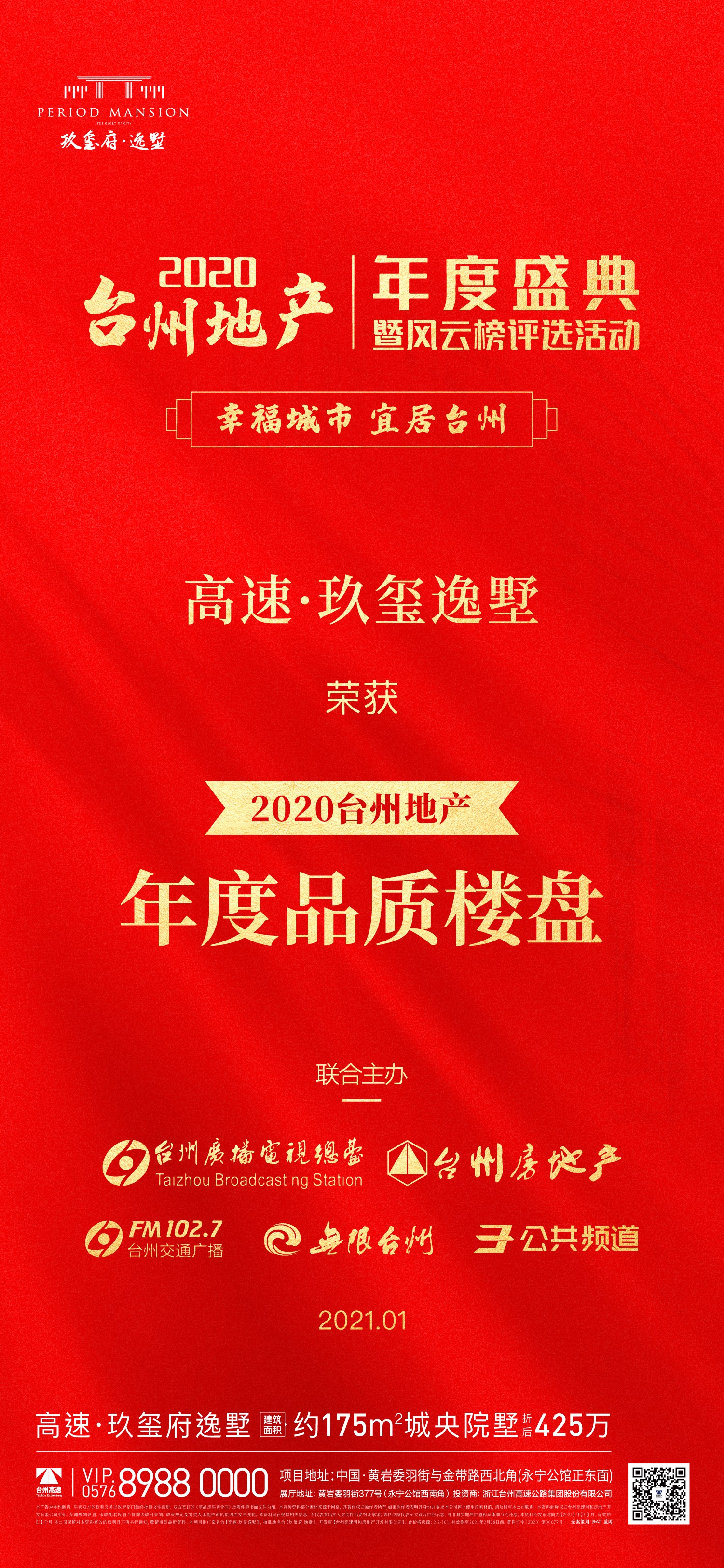 2021年1月19日下午,由臺州廣播電影電視集團聯(lián)合臺州市房地產業(yè)協(xié)會共同舉辦的2020臺州地產年度盛典暨臺州地產風云榜,在全城熱矚下重磅舉行。高速房產玖璽府·逸墅項目榮獲“2020臺州地產年度品質樓盤”榮譽稱號。