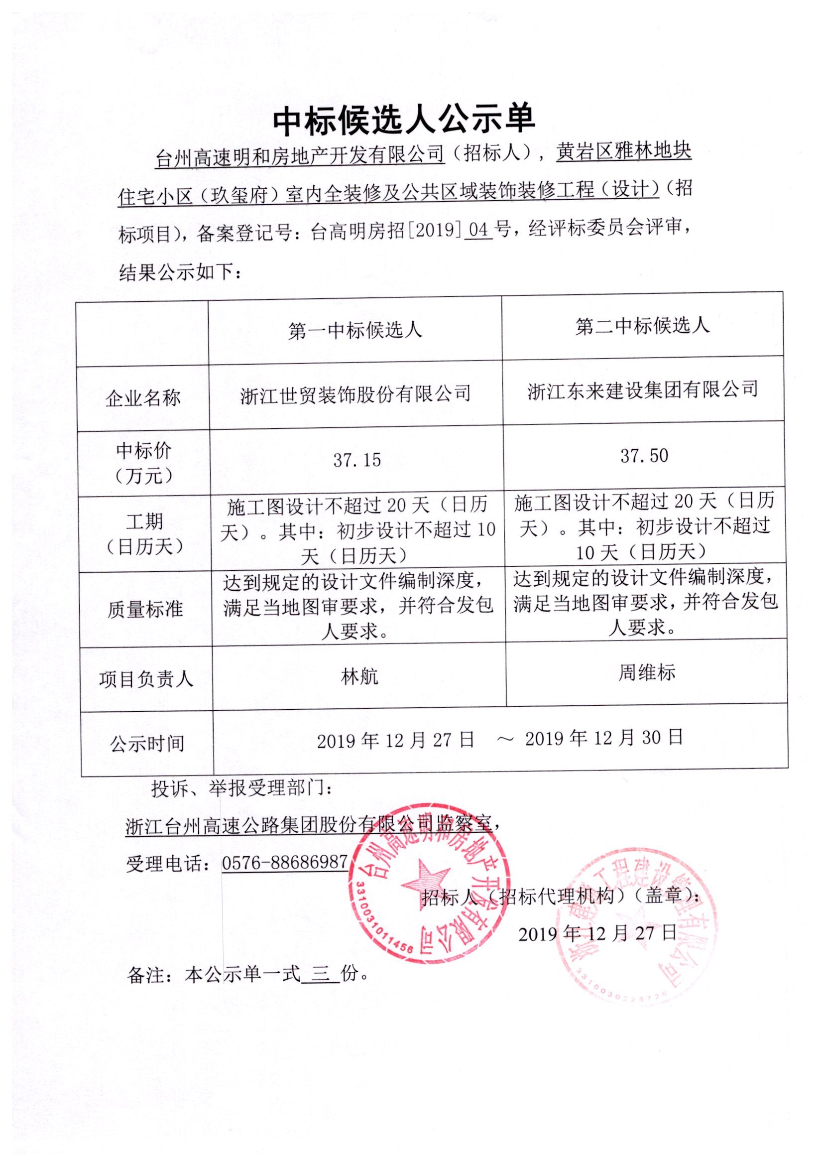 黃巖區(qū)雅林地塊住宅小區(qū)(玖璽府)室內(nèi)全裝修及公共區(qū)域裝飾裝修工程(設(shè)計(jì))中標(biāo)候選人公示單