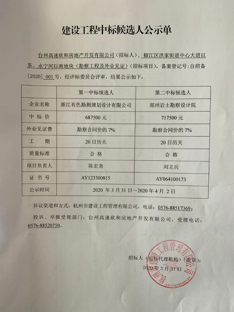 椒江區(qū)洪家街道中心大道以東、永寧河以南地塊(勘察工程及外業(yè)見證)(招標項目)中標候選人公示單