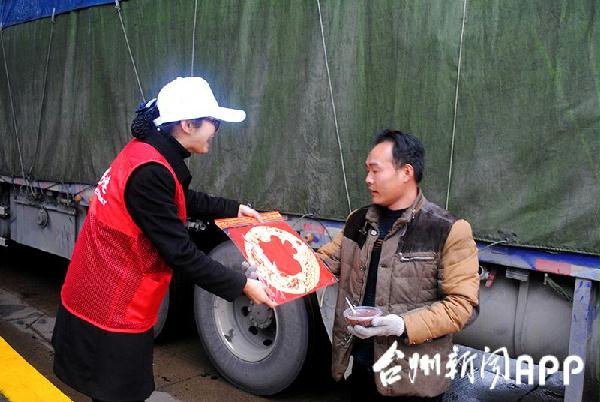 圖為志愿者為司機送上“?!弊帧`嶇z