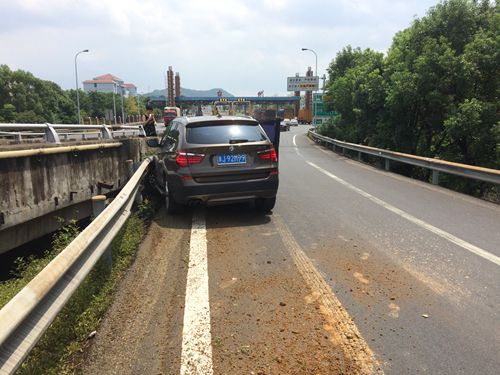 8月13日上午10:30分左右,臺州收費所出口寧向匝道口有一輛黑色寶馬X3斜靠在護欄旁,其車頭左側(cè)因碰撞護欄而嚴重凹陷,左前輪胎報廢。 當時,該所出口五號車道的欄桿發(fā)生故障,需要暫時關(guān)閉進行維修。班長張海勇在內(nèi)廣場引導車輛時發(fā)現(xiàn)此起事故,走近細看,由于碰撞激烈該車前檔玻璃破裂,前排安全氣囊彈出,而車旁的兩個人驚恐未定不知所措。此時匝道口車流不斷,因駕駛員遲遲找不到三角牌,為避免二次事故的發(fā)生,張海勇在車后方指揮交通,并提醒車旁人員站在護欄外安全位置,同時報告指揮中心事故車的位置和損傷情況。