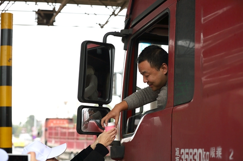圖為志愿者向司乘人員發(fā)放宣傳單 活動(dòng)現(xiàn)場(chǎng),志愿者們送上熱騰騰的散粉糊、紅糖姜茶,并向貨車(chē)司機(jī)發(fā)放貨車(chē)非現(xiàn)金支付優(yōu)惠宣傳單。大家積極為過(guò)往的司乘人員送上冬日的一份溫暖和關(guān)懷,驅(qū)散他們路途的寒冷,贏得了他們的肯定。