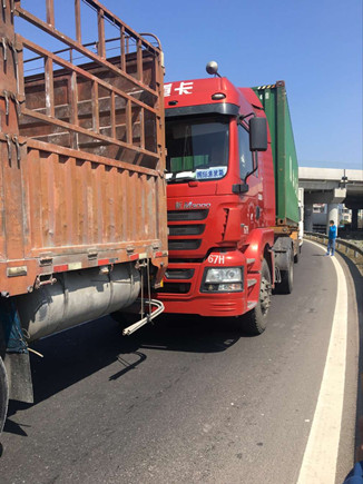 上圖為事故車輛 當(dāng)天中午,在副站崗?fù)づ哉镜墓ぷ魅藛T發(fā)現(xiàn)該所前方出口不遠(yuǎn)處有貨車停在那里不動(dòng),以致后面車輛無(wú)法通行。工作人員隨即跑到前方查看情況,原來(lái)是三輛貨車發(fā)生追尾,其中有一輛車車頭被撞得凹陷,擋風(fēng)玻璃也被撞碎,在了解事故現(xiàn)場(chǎng)無(wú)人員受傷后,工作人員馬上向監(jiān)控中心匯報(bào)情況。由于事故車輛較大面積滯留,導(dǎo)致后方車子堵到主線上,一些不明情況的駕駛員在車?yán)锸箘虐蠢却叽?,現(xiàn)場(chǎng)充滿焦躁情緒。 如何盡快疏通道路?正在食堂吃飯的一班班長(zhǎng)潘慶耀放下碗筷跑到事故現(xiàn)場(chǎng),同工作人員叫前面受損較少的事故車輛先把車子開出收費(fèi)站,再讓第三輛受損嚴(yán)重的車子試著發(fā)動(dòng)車子開出去,所幸三輛車子都能開離車道。在將地上的破損碎片清理到車道兩旁后,工作人員繼續(xù)指揮車輛向前行駛,收費(fèi)內(nèi)廣場(chǎng)在較短時(shí)間內(nèi)恢復(fù)了正常通行。 沈芬芳
