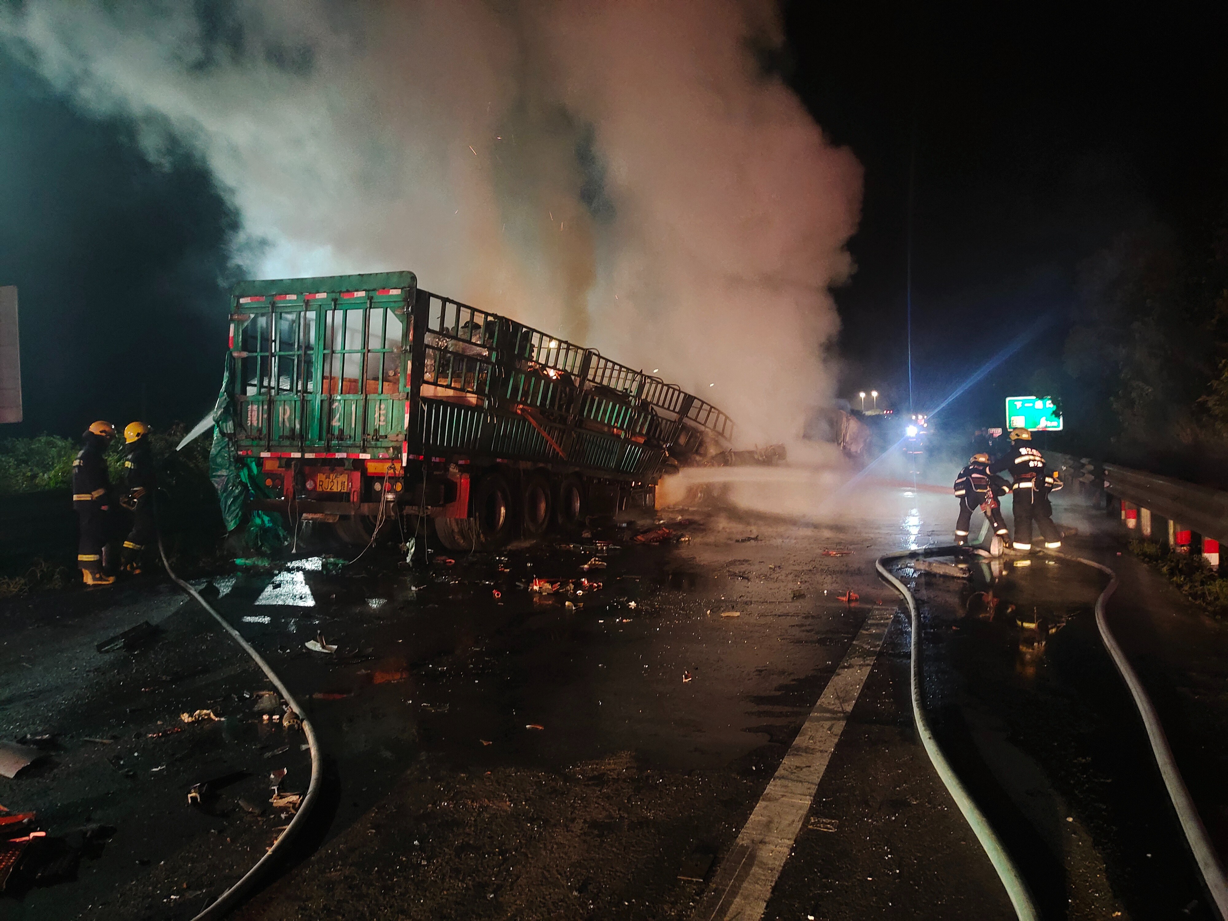 4月21日凌晨2點,G15沈海高速甬臺溫段寧波方向距離黃土嶺隧道不到2公里的地方,有一輛半掛車與前車發(fā)生追尾事故,隨后起火燃燒。