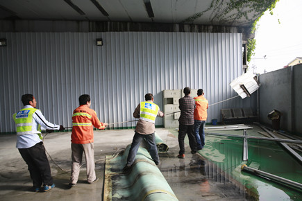 圖為工人在合力拆除違建物 現(xiàn)場(chǎng)經(jīng)過兩個(gè)多小時(shí)切割作業(yè),成功完成拆除。