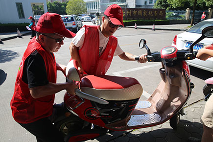 上圖為志愿者服務(wù)隊合力推離停放不規(guī)范的電瓶車、三輪車