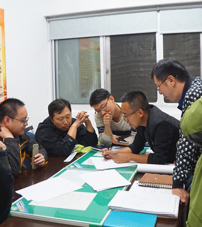 圖為楊金梁和工地隊員檢查施工機械設(shè)備