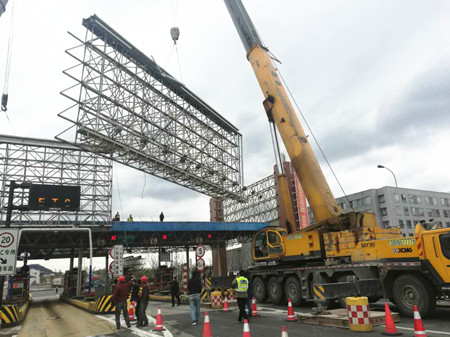 因拆除作業(yè)涉及車道臨時封閉,又不能影響進出高速車輛的通行,如何兼顧施工和萬千過往人民的安全,楊金梁的心里得有一把清楚的標尺。11月22日,天還未亮,他就從椒江急急地趕往臺州收費站拆除現(xiàn)場。6點始,大噸位的吊機已放置在指定位置,施工人員安全帽、安全繩,收費站內(nèi)外廣場引導員,高速主線封道預警車等是否都已到位,楊金梁逐一迅速檢查,絲毫不敢遺漏任一安全環(huán)節(jié)。