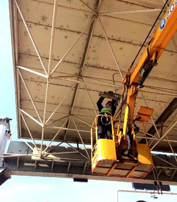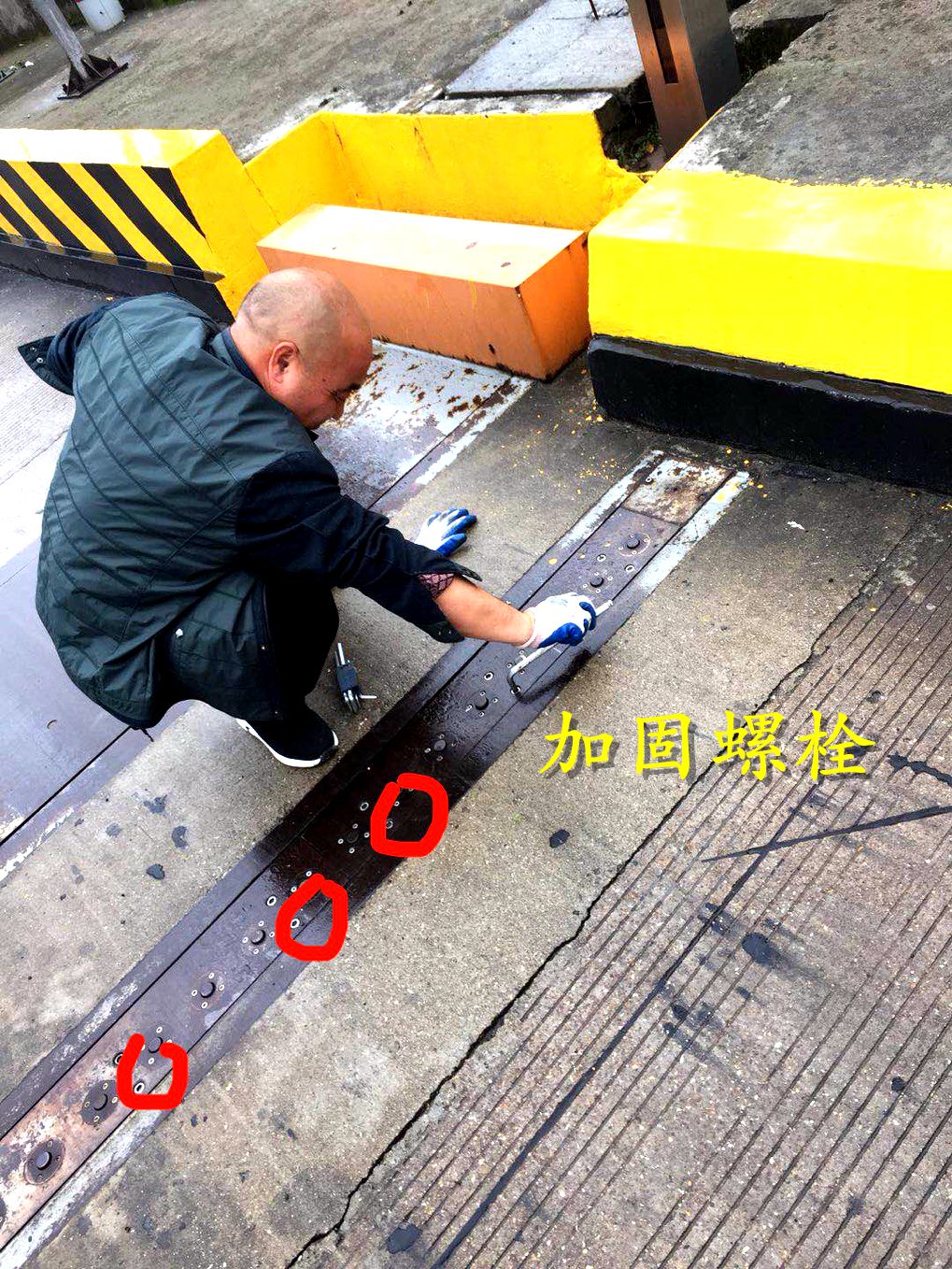 圖為隊(duì)員正在更換車道頂棚燈 期間在臺(tái)州南收費(fèi)所發(fā)現(xiàn)有兩個(gè)車道出現(xiàn)異常,即當(dāng)重型車輛通過(guò)時(shí),輪檢鐵板和稱臺(tái)出現(xiàn)不正?;蝿?dòng)情況。根據(jù)以往經(jīng)驗(yàn),此情況如不進(jìn)行及時(shí)維修,對(duì)車輛計(jì)重將造成嚴(yán)重影響。對(duì)此,技術(shù)人員不僅對(duì)鐵板上每顆螺栓都進(jìn)行了認(rèn)真細(xì)致的重新加固,之后不厭其煩對(duì)每個(gè)稱臺(tái)限位都進(jìn)行了多次調(diào)整,直至將晃動(dòng)幅度控制在正常范圍內(nèi)。