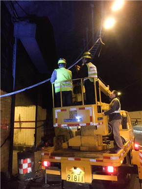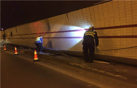 此時此刻,維養(yǎng)中心值班同志已經(jīng)馬不停蹄地奔往現(xiàn)場,中心負(fù)責(zé)人從臨海速度趕往現(xiàn)場。經(jīng)檢查,掛落電纜系汽通門控制線,不影響隧道內(nèi)照明、通訊系統(tǒng)的正常運行。當(dāng)機(jī)立斷,決定采取臨時加固的緊急措施,及時聯(lián)系協(xié)調(diào)交警部門,請求封道施工的幫助和支持。