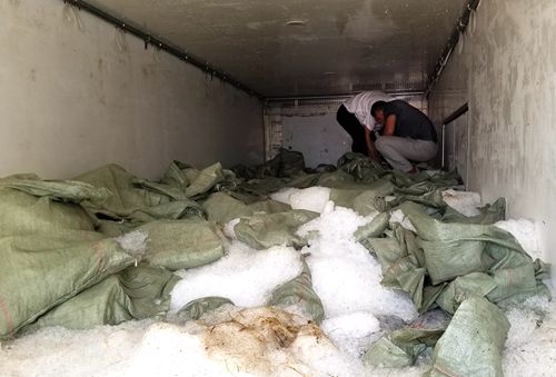 李貴陽(yáng)打開車輛后廂門,迎面撲來一陣?yán)滹L(fēng),一眼望去車廂里面全部是一袋袋的花蛤,上面還壓著袋裝的冰塊和零碎的碎冰,車廂內(nèi)部看不清楚。憑借多年的工作經(jīng)驗(yàn)和認(rèn)真負(fù)責(zé)的工作態(tài)度,李貴陽(yáng)二話沒說,直接爬上濕滑的車廂,踏過冰袋和碎冰,深入到車廂里面去檢查,把冰袋掀開后,結(jié)果發(fā)現(xiàn)下面全部是空桶。原來這樣做既可以增加貨物面積也可以使重量加重,從而達(dá)到綠農(nóng)政策的免費(fèi)通行要求。