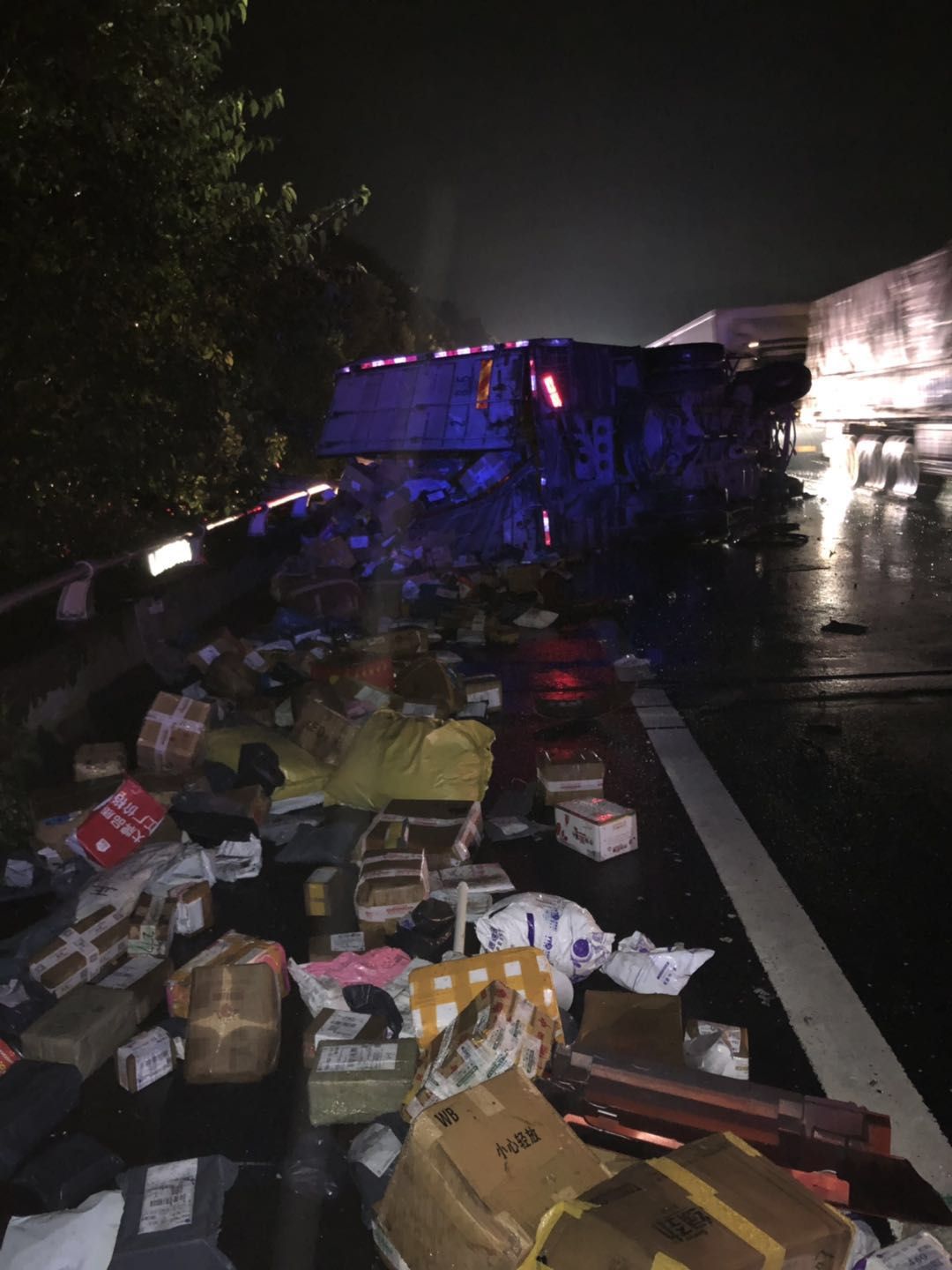 7月14日凌晨1點,溫州方向臺州南收費所附近,一輛半掛型大貨車和一輛快遞車相撞,半掛車直接沖出高速,四腳朝天。快遞車則是被巨大的沖擊力撞向了硬路肩,側(cè)翻中撒下數(shù)十米的貨物。1點10分,救援車輛到達現(xiàn)場,現(xiàn)場一片狼藉,防撞護欄板、護欄柱損傷嚴重,橋梁鋼管都折斷了不少。