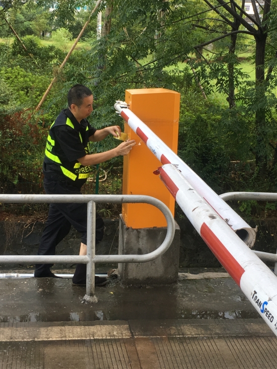 圖為工作人員在對欄桿機(jī)作防水處理