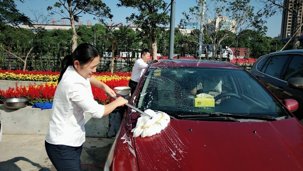 溫嶺西支部書(shū)記周超帶領(lǐng)黨員服務(wù)群眾 當(dāng)天上午,活動(dòng)一開(kāi)始,前來(lái)洗車(chē)的車(chē)輛絡(luò)繹不絕。在支部書(shū)記周超的帶領(lǐng)下,五名黨員便開(kāi)始分工合作。兩名男同志負(fù)責(zé)沖水、上泡沫、擦洗、再?zèng)_水,兩名女同志負(fù)責(zé)擦干和吸塵器清掃內(nèi)室,還有一名男同志負(fù)責(zé)開(kāi)車(chē)挪車(chē),需要清洗的車(chē)輛一輛接著一輛,黨員同志們顧不得擦干身上的被水濺濕了的衣服,忙得不亦樂(lè)乎。看著被洗得一塵不染的車(chē),大家都不約而同地會(huì)心一笑。