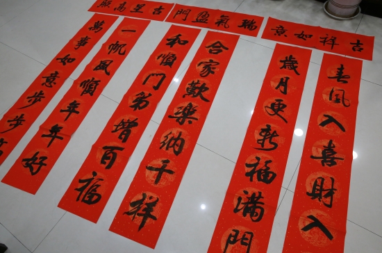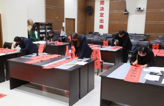 圖為學(xué)員學(xué)習(xí)寫書法 本次活動(dòng)由集團(tuán)辦公室牽頭組織,以集中書寫和分開書寫相結(jié)合的方式進(jìn)行。參與者在百忙之中抽出自己的業(yè)余時(shí)間,積極參與到活動(dòng)中來(lái),共同書寫500多幅春聯(lián)作品。春節(jié)臨近,集團(tuán)全體員工和集團(tuán)兩個(gè)結(jié)對(duì)村的100戶村民都將收到暖暖的“送春聯(lián)”祝福。 當(dāng)日集中書寫現(xiàn)場(chǎng),參與者們認(rèn)真埋頭書寫,并不時(shí)地相互請(qǐng)教學(xué)習(xí)。有的下筆蒼勁有力、筆精墨妙,有的如行云流水一筆而下,有的力透紙背,一個(gè)個(gè)大字很快躍然紙上。